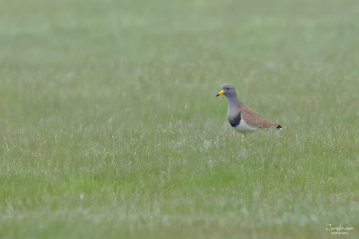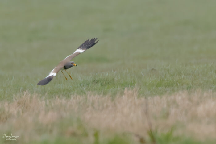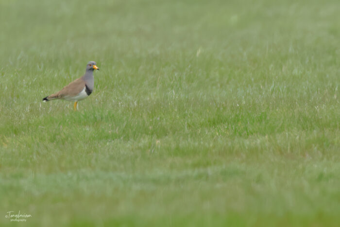 An attractively marked lapwing, with a grey head and neck that extends onto the upper breast, bright yellow bill, with a black tip. A white belly that is separated from the grey upper breast by a blackish breast band. The upper-parts are a pinkish brown and when in flight, the striking black primary feathers and white secondaries, as well as a white rump and dark tail are striking. Long yellow legs and a red eye.