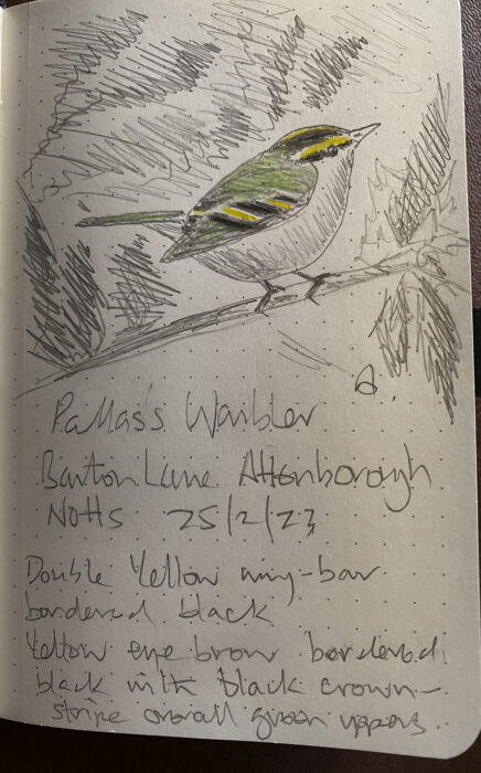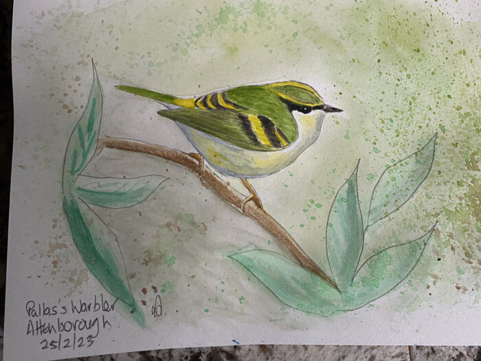 Some amazing news came out on the birding network on Thursday 23rd February, that a Pallas’s Warbler had been discovered at the Nottinghamshire Attenborough Reserve. It was favouring hedgerows, gardens and the Bushes in the Hotel grounds along Barton Lane. An amazing find, especially this far inland, and at this time of the year.