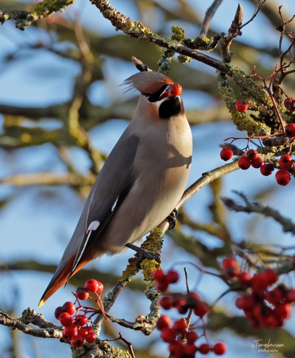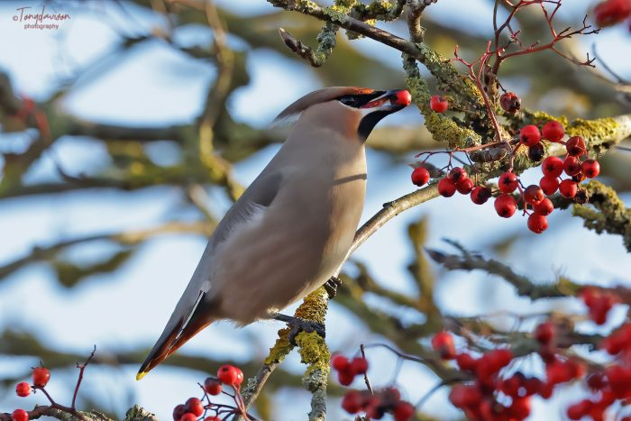 A friend paid me a visit on 16th December to drop off Christmas Cards, just before he left, he picked up a Waxwing perched on a high Conifer tree at the bottom of our road. The bird spent the rest of the late morning feeding in a neighbours secluded garden. My neighbours kindly allowed me access to their garden, and I was able to take a few photographs. It also spent time in the afternoon, perching on the tops of conifers and silver birch trees, covering a wide area, and using them as vantage points. It would then perform flying sorties after insects, it was a mild afternoon, before it disappeared, presumably to roost. It was a first winter male and was still around early morning on the 17th, when I saw it perched high up on what appeared to be its favoured conifer tree. After a brief fly-around it disappeared over houses and I never saw it again.