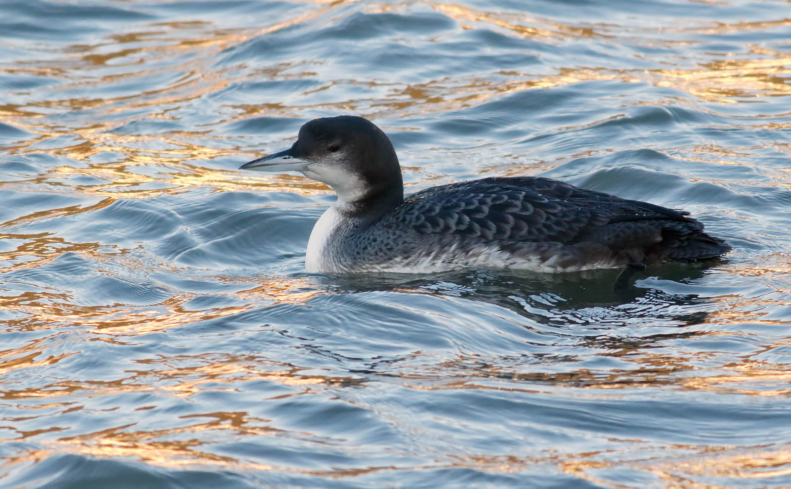 Great Northern Diver – 1st winter (juvenile) note the heavy scaly markings on the back. Swimming through a sea of gold, “ain’t nature beautiful”? – Scarborough – Tony Davison©